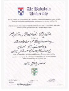 In addition to his academic excellence, Ayilla demonstrated leadership and commitment to service as the General Secretary of the Nigerian Institute of Civil Engineers Students’ Affiliate (NICESA). His hands-on experience during internships further strengthened his engineering expertise and practical skills.