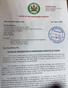 The Minister of Power, Bayo Adelabu, has tendered his resignation from the cabinet of President Bola Tinubu.Naija News reports that Adelabu addressed his letter of resignation, dated April 22, 2026, to President Tinubu through the Secretary to the Government of the Federation.