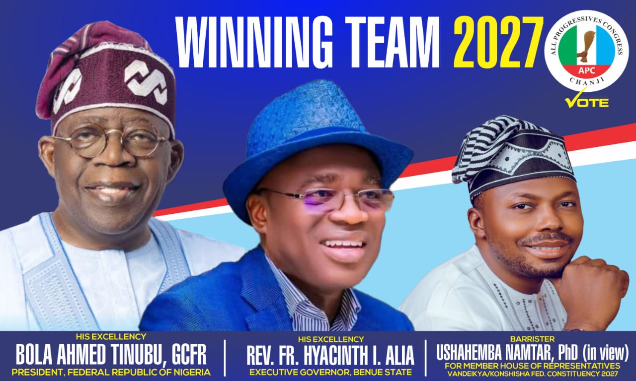Think Namtar, talk Namtar, support Barr. Ushahemba Namtar for the House of Representatives, Jechira Federal Constituency, 2027 and Governor Alia and President Tinubu for consolidation in 2027.